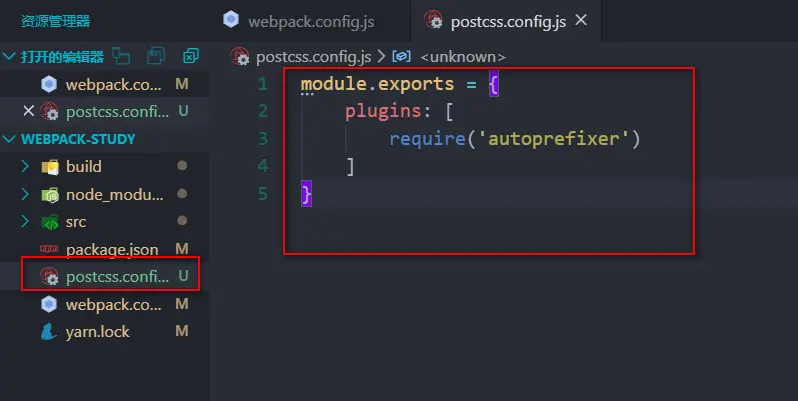postcss.config.js(在项目的根目录下建立) ,这个配置文件里面的内容需要导出自动加前缀的插件: