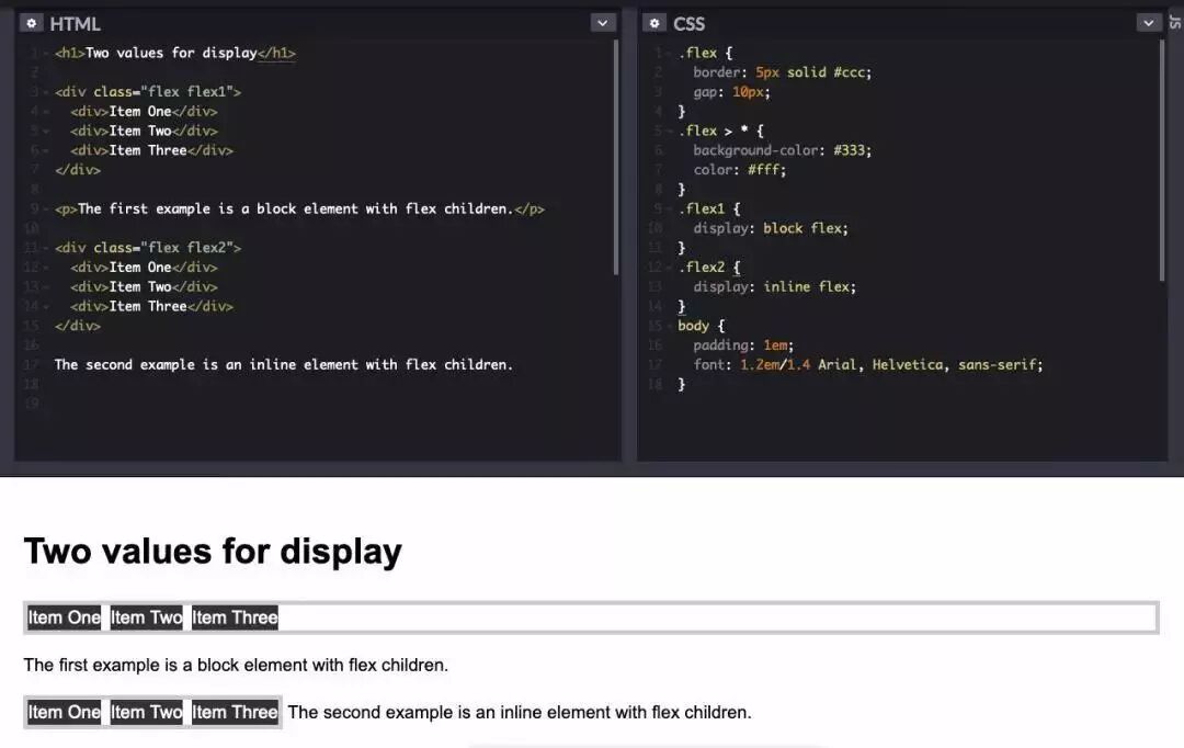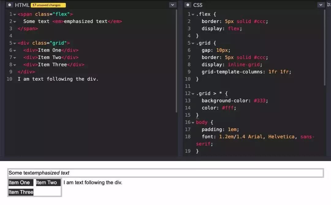 display: grid和display: flex对一个元素的产生了对外和对内两方面的影响。当一个原本是内联元素 span的display属性被设置为flex,这个 span元素就会变为一个块级元素,但其子元素却变为flex元素。如果我们想要这个被应用display: grid或 display: flex的元素保持内联效果不变,则可以设置其为display: inline-grid或 display: inline-flex。请看下面的代码片段: