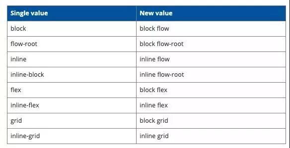 为了更好地描述这个行为,css的display属性的标准中现在允许接收两个值,第一个值用来描述他的外在表现,第二个值用来描述其子元素的格式。下面的列表中展示了部分新标准与单一值的对照:
