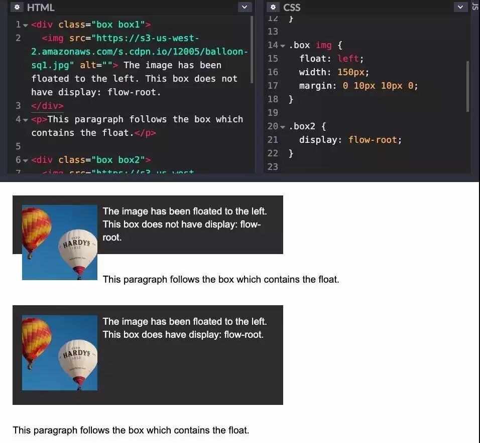 下面的示例中展现了应用flow-root及未应用的区别。