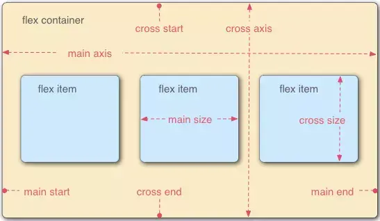 项目默认沿主轴排列,单个项目占据主轴空间(宽度)叫做main size,项目占据交叉轴空间(高度)叫做cross size