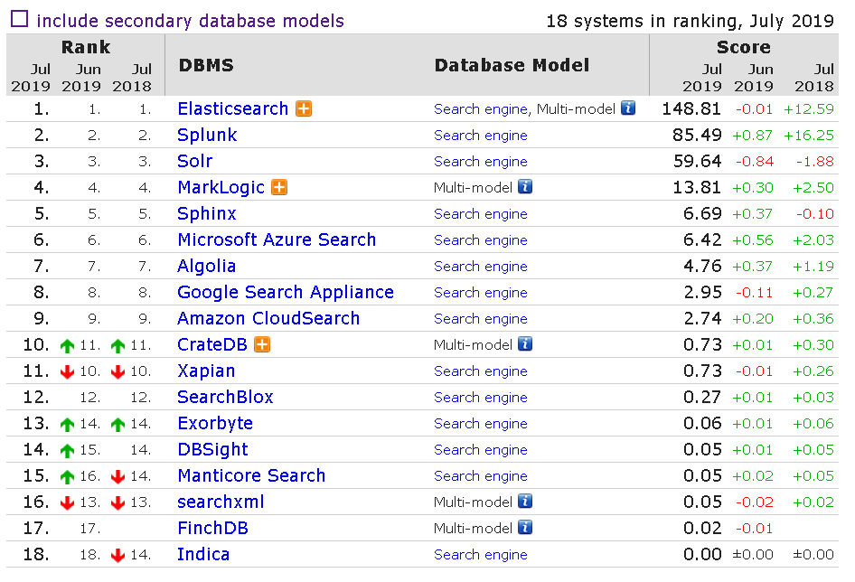 代码搜索系统遇到的另外一个困难是搜索太慢,为此我们引入了sphinx索引工具,为什么选择sphinx索引工具呢。该工具支持高达数十亿个文档,数TB的数据和每秒数千个查询。支持各种数据源,包括xml,sql,python等。支持结果的各种过滤聚合功能,快速高效的索引,应用场合广泛,比如维基百科,优酷土豆,github等。下图是今年的索引工具的排行榜,可以看到sphinx排在第5,受众范围广。