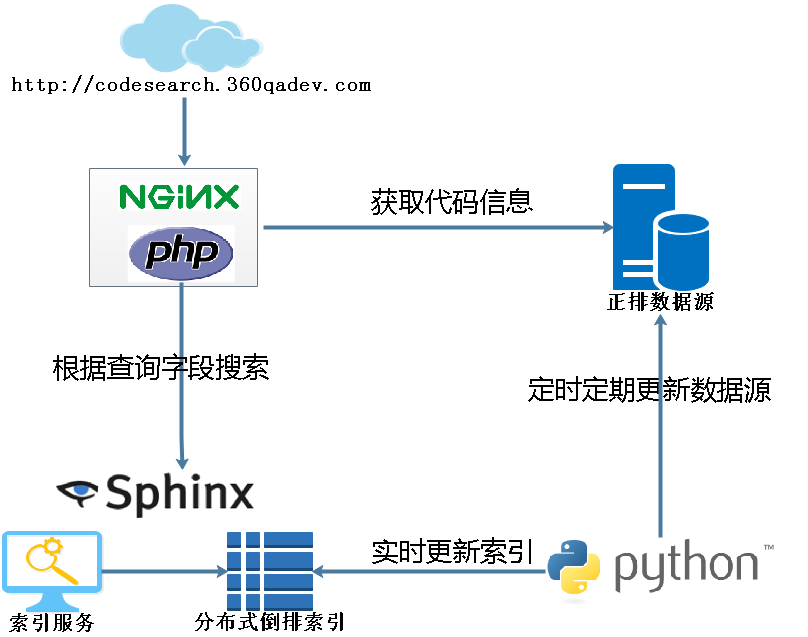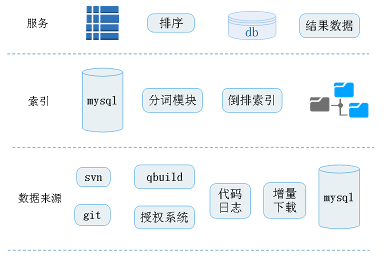 大致分为3层 最下面一层数据来源层,支持svn和git的代码仓库,来源包括qbuild系统和授权系统,获取代码日志,增量下载文件,最后存储在数据库中。 索引层主要是从数据源中获取文档信息,然后经过分词模型,倒排索引算法,将索引存储在文件系统中。服务层主要是sphinx索引工具提供的索引服务,通过排序,获取索引文档信息后,从正排数据库中拿到文档全部信息,返回结果数据。