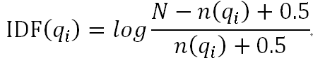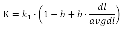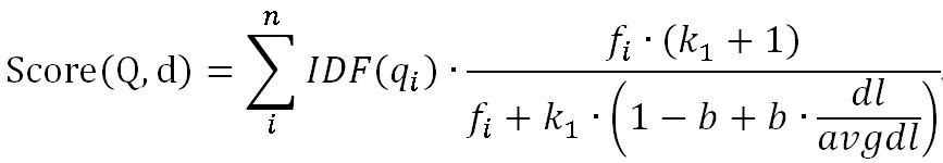 Score(Q,d)是衡量某次query查询和文档的相关性计算公式,d表示当前文档,Q是query中所有的关键字集合,qi是其中的某个关键词,n是Q的长度,Wi是这个词的权重,R(q,d)是这个词和文档的权重。Wi默认是IDF值,N表示所有文档数,n(qi)表示包含该关键词的文档数,0.5是避免n(qi)为0的情况。大致的意思是关键词在所有文档中出现频率越多说明越普遍,就越不重要,权重越低。R(q,d)是这个词和文档的权重,大致的意思是某个关键词在该篇文档出现的次数越多,说明越重要。