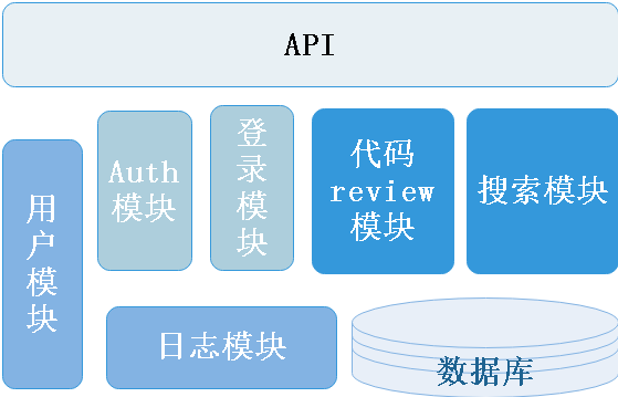 代码搜索的服务端为前端或其他系统提供API接口,一共有6大模块,包括搜索模型,登录模型,校验模型,用户模块,日志模块,代码review模块。数据库为上述6大模块提供数据支持。