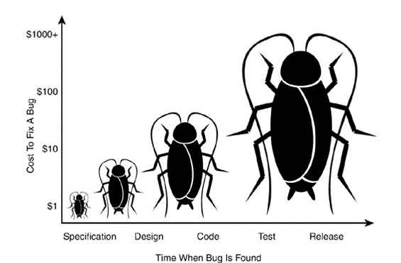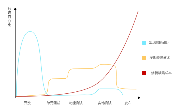 如下图中红色的曲线,横坐标是产品发布流程,纵坐标是修复缺陷成本,可以看出,在测试阶段,修复成本比较低,在产品发布之后,修复成本是成指数增长的。