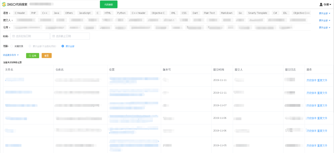 下面这个图是代码搜索的一个demo,主要有3部分构成,最上面是搜索输入,中间是过滤条件,包括时间,代码语言,归属人,代码仓库。最下面是搜索的结果,主要包括文件名,仓库名,文件位置,版本号,提交日期和归属人,测试人员可以根据仓库和归属人信息找到对应的开发负责人,进而督促修复漏洞。