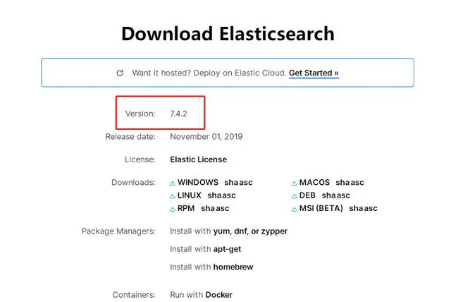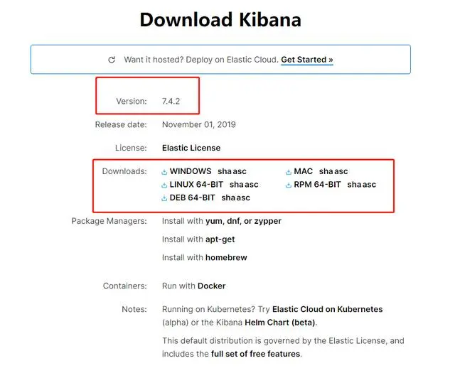 点进去红框的Elasticsearch和Kibana就可以找到下载页面了,ElasticSearch的版本出到7.4.2了,注意的是,下载Kibana的时候版本也要跟Elasticsearch的版本对应,然后选择自己电脑相应的操作系统。