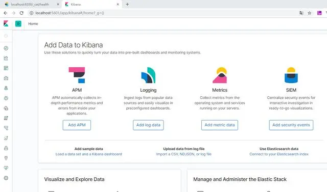kibana默认启动在5601端口,浏览器验证一下就可以看得到图形界面了: