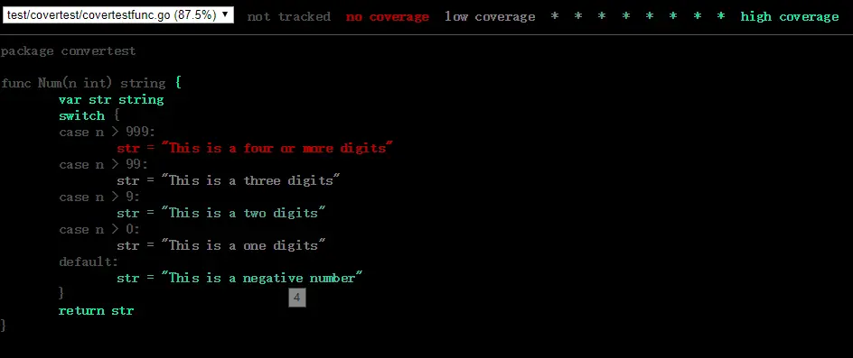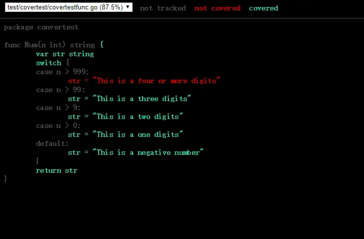 go test -coverprofile=cover.out,-coverprofile会自动启用覆盖率分析,不必再增加-cover。要研究这份数据的话,还需要借助一些工具。 将覆盖率按函数分解:go tool cover -func=cover.out将覆盖率以html的方式展示:go tool cover -html=cover.out,将生成的html文件在浏览器中打开,可以看到3种颜色,已覆盖(绿色),未覆盖(红色)和 未埋点(灰色),通过这些手段可以轻易的看到哪些代码没有被覆盖到,然后增加测试用例以提高覆盖率