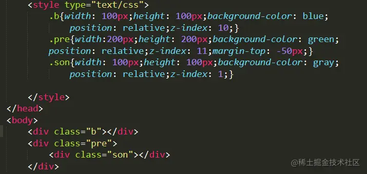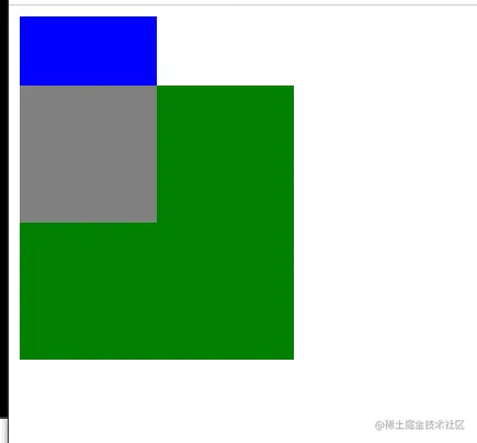 这里给灰色盒子的父元素(绿盒子)设置了较大的z-index值,他的灰盒子元素也跟随着大于了蓝色盒子,所以就把蓝色盒子覆盖了