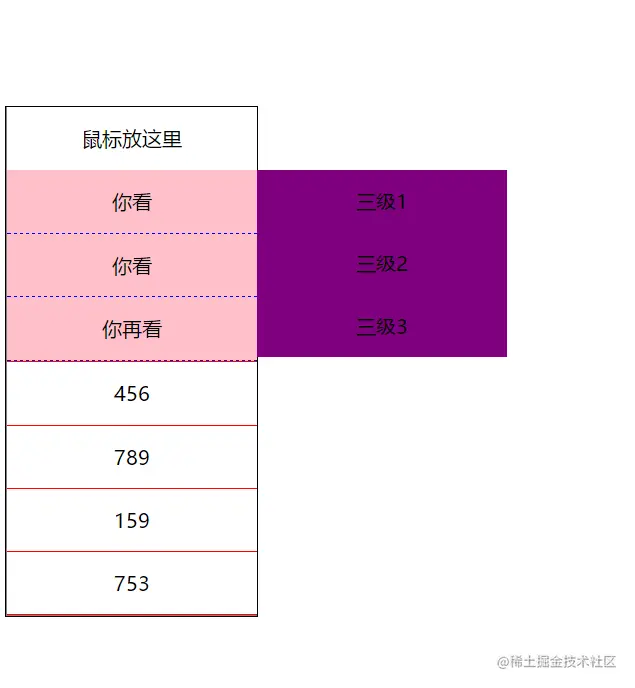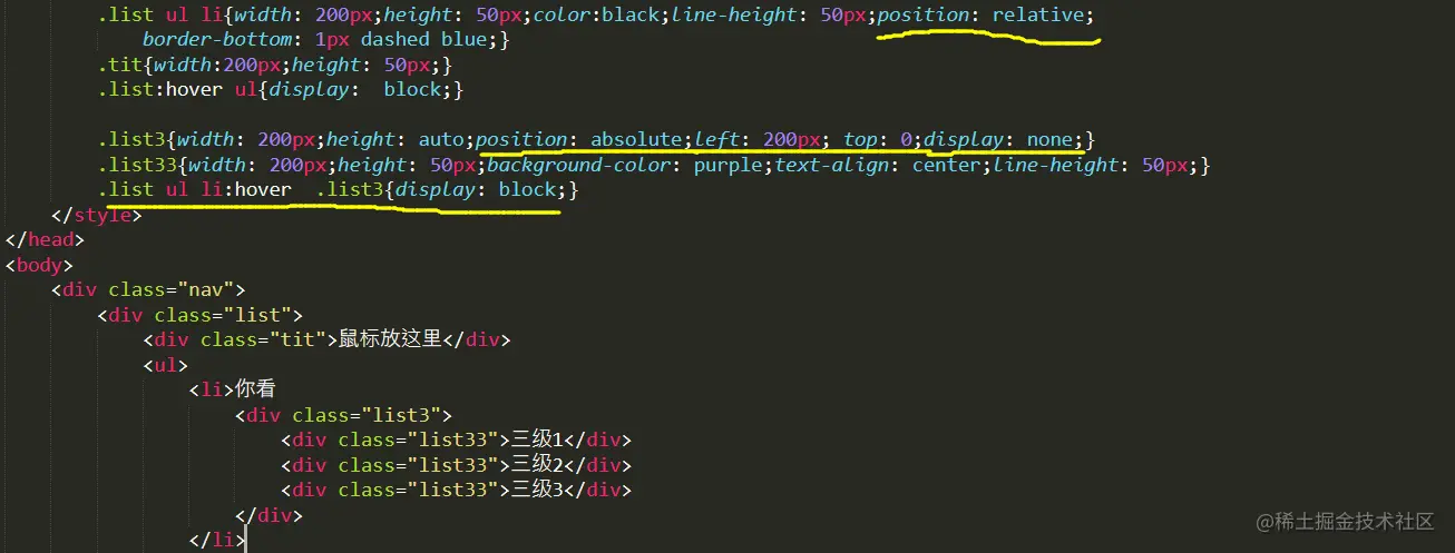 在二级菜单的基础上添加position属性增加美观度,给“你看”盒子添加了position:relative属性,再给“list3”盒子添加position:absolute属性(以父元素左上角为原点向右向下为正方向),最后给相应盒子添加伪类属性