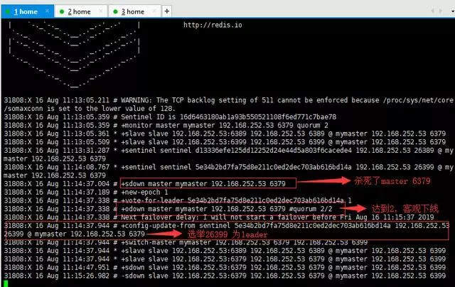 kill -9 19688 看日志,三个哨兵的监控日志基本上是一样的,下图贴出三个哨兵的日志,我们就看一下第一个哨兵的日志分析一下。