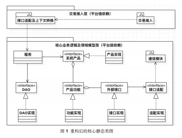 图 1 中,将原来的“服务层”定义为交易接入层,增加了接口适配上下文转换、服务、系
