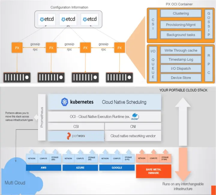 Portworx 以容器服务的方式部署,每个节点称为 PX,向下对接各种公有云的块存储或者裸金属服务器,向上提供块或文件服务。