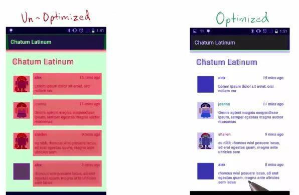例如:某个 Activity 有一个背景,然后里面的 Layout 又有自己的背景,同时子 View 又分别有自己的背景。仅仅是通过移除非必须的背景图片,这就能够减少大量的红色 Overdraw 区域,增加蓝色区域的占比。这一措施能够显著提升程序性能。