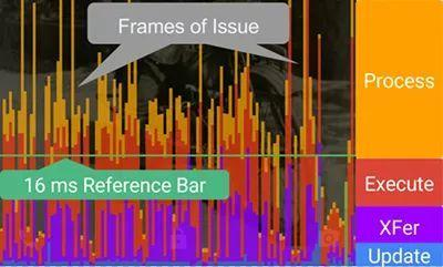 屏幕下方的柱状图每一根代表一帧,其高度表示「渲染这一帧耗时」,随着手机屏幕界面的变化,柱状图会持续刷新每帧用时的具体情况(通过高度表示)。