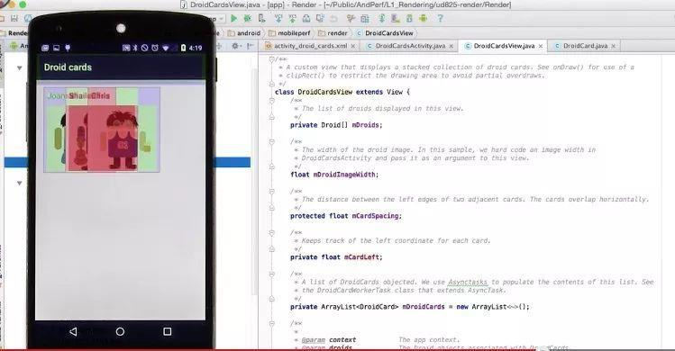 上面的示例图中显示了一个自定义的View,主要效果是呈现多张重叠的卡片。这个 View 的 onDraw 方法如下图所示: