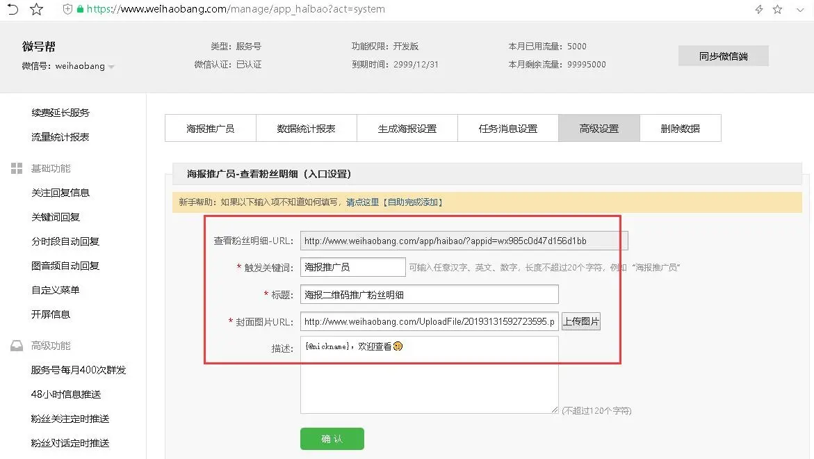 粉丝首次在公众号生成海报提示,其他人通过海报关注后提醒消息,海报任务完成后消息推送,超链接、表情符号、会话代码都可以使用。