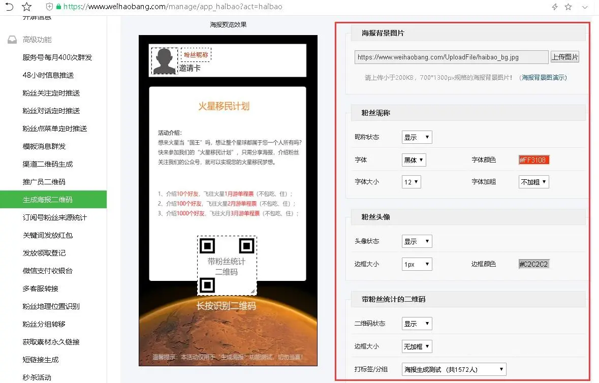 二维码海报生成,在微号帮平台上操作,然后在自己授权的公众号里生成海报,海报支持自定义背景,昵称、头像、二维码操作,还可以打标签分组。