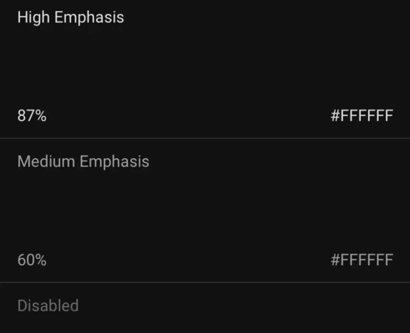 文字在深色主题下默认会被设置为纯白色(#FFFFFF),但#FFFFFF是一种很明亮的颜色。它会在黑暗的背景下产生视觉“抖动”,这就是为什么谷歌设计规范推荐使用稍微暗一些的白色: