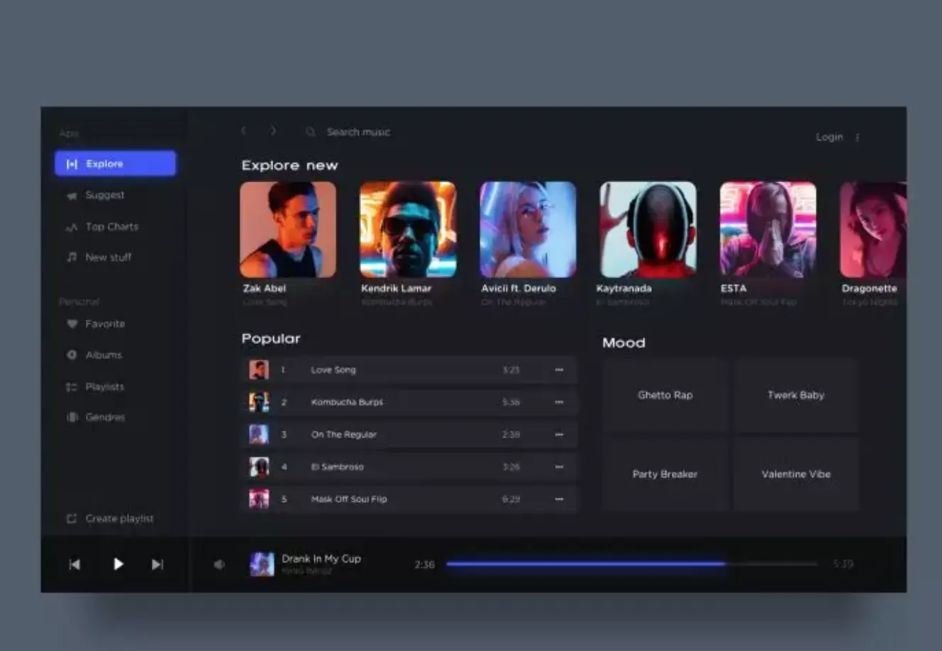 使用深灰色作为主要界面的配色会更安全。由于在深灰色界面上文字的对比度相对于纯黑色界面上文字的对比度会更小,对人眼的压力也就小很多。另外,深灰色的界面也能有更多的颜色选择,投影也更好做(纯黑色是不好做黑色投影的)。