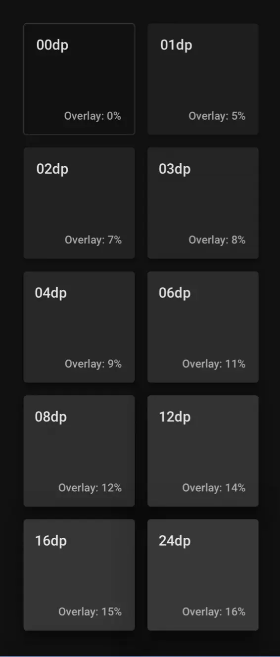 在谷歌设计规范中,深色主题的空间感使用不同的明度来设计。更高的明度,更轻的界面。