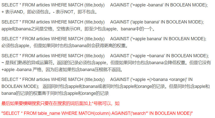 一。MATCH(title) against('+zhang -lishi ~wangwu zhaoliu*' IN BOOLEAN MODE) +表示and,-表示not,~表示异或运算符,*表示所有,空格表示or 等等