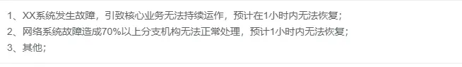 b:'1、XX系统发生故障,引致核心业务无法持续运作,预计在1小时内无法恢复;\n2、网络系统故障造成70%以上分支机构无法正常处理,预计1小时内无法恢复; \n3、其他;'