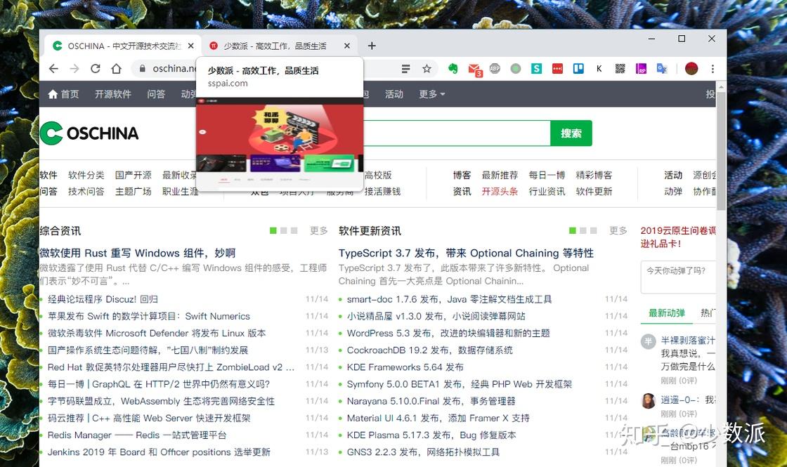 开启之后当鼠标悬停在标签页时将可以看到网页内容的预览窗口了,不用切换标签页就可以看到内容可以说更为方便一些,不过这项功能对系统性能有一定的要求,如果想要更好的浏览体验可以酌情开启。
