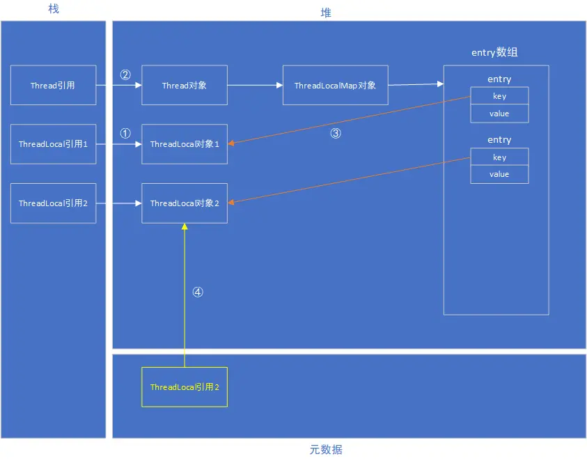 (2)ThreadLocal1使用之后会出栈,此时①处强连接断开,ThreadLocal对象1只有entry中的key的弱连接与之关联,下一次YGC时③处连接会断开,ThreadLocal对象1被回收,此时entry中key对应的值为null;