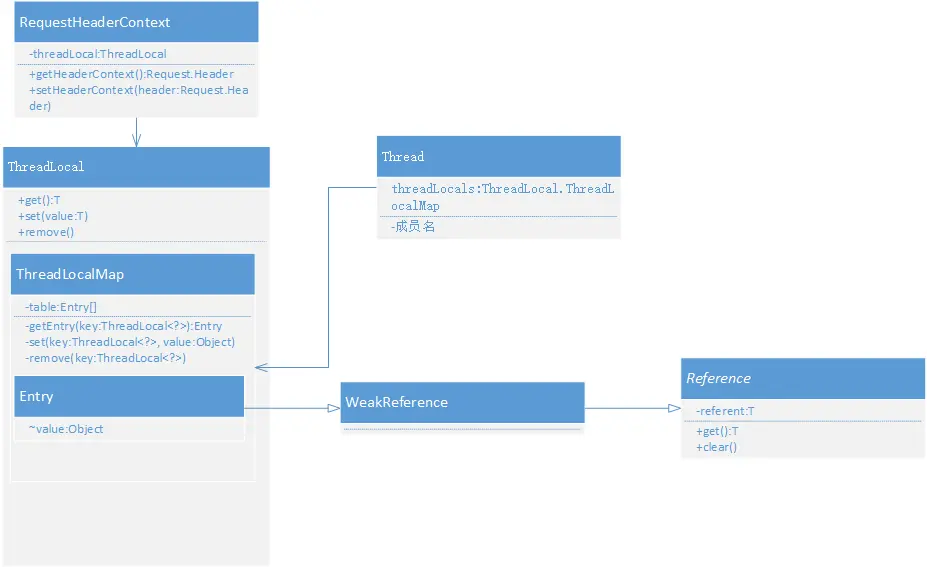 如上图所示,线程对象持有ThreadLocalMap对象的引用,ThreadLocalMap对象持有entry数组的引用。调用ThreadLocal的set方法实际存值在entry的value中,entry的key为ThreadLocal的弱引用。