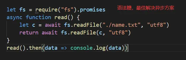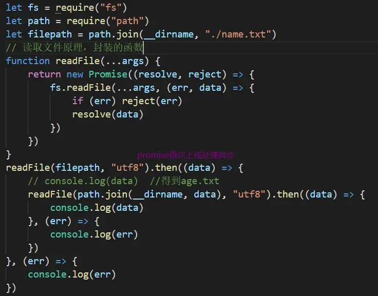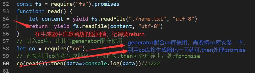 生成器读取文件需要配合Promise使用,文件的读取产生promise,可以直接.then处理,这样照样会产生Promise嵌套问题。