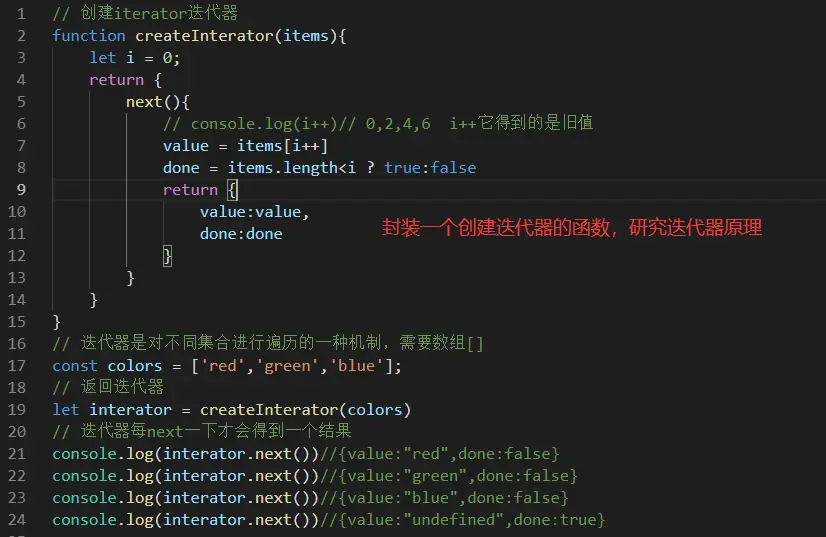 迭代器就是为实现对不同集合进行统一遍历操作的一种机制,它本质是个对象。对象中一定存在一个next函数,函数返回值又是个对象,对象中存在两个属性:value和done。以下是依照概念封装的,创建迭代器的函数:
