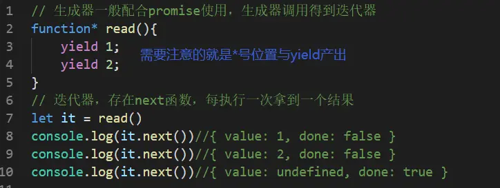 生成器Generator属于ES6中的语法,用来解决异步操作。形式上,Generator函数是一个普通函数,但是有两个特征:一是,function关键字与函数名之间有一个星号;二是,函数体内部使用yield表达式,定义不同的内部状态(yield在英语里的意思就是“产出”)。
