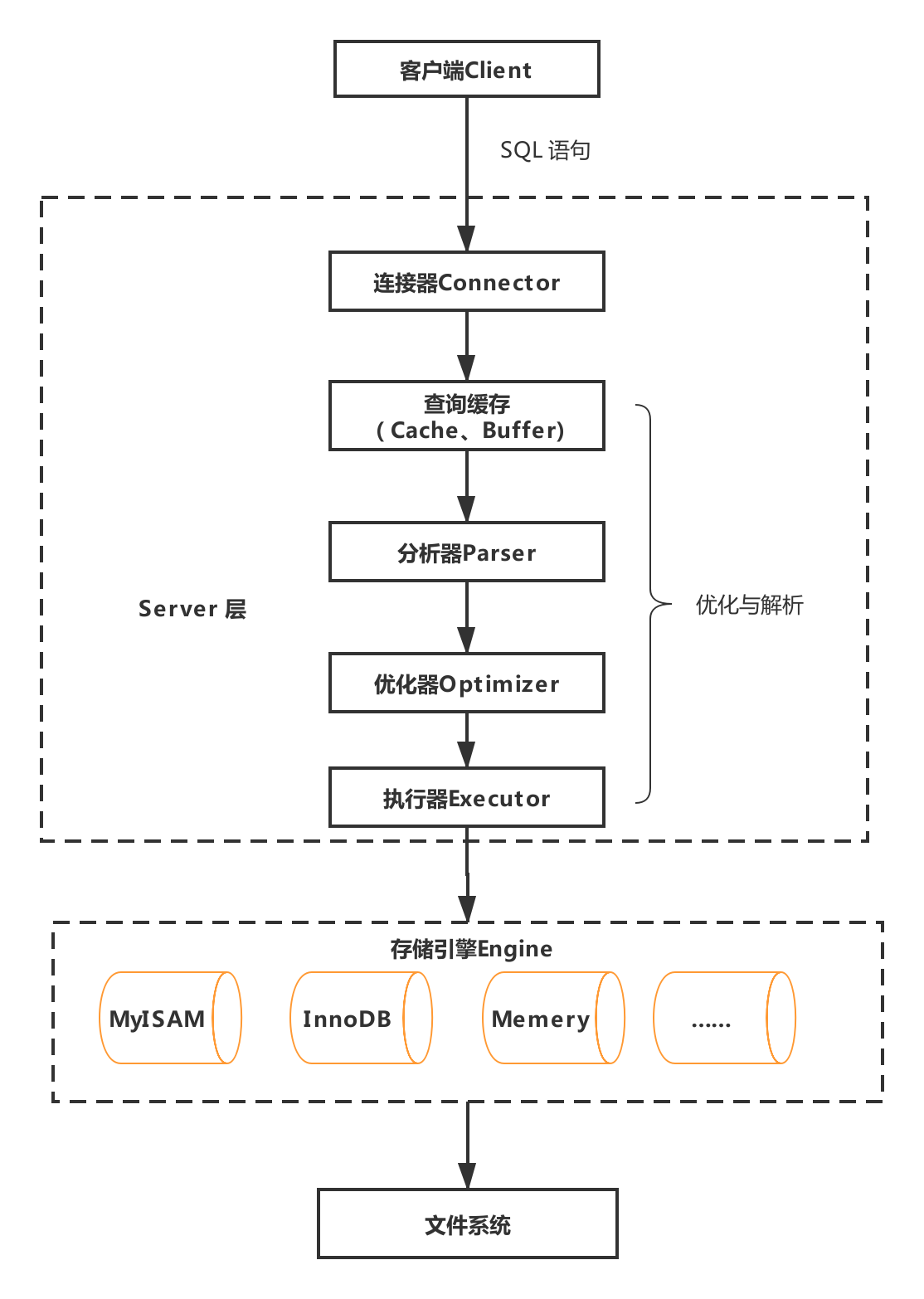 在我们执行SQL后,例如一句简单的select * from user where name = ‘yanger’,客户端发送请求到服务端,请求到达Server层,会经过连接器、查询缓存、分析器、优化器、执行器等,最终通过存储引擎从文件系统获取数据或者插入数据到文件系统。