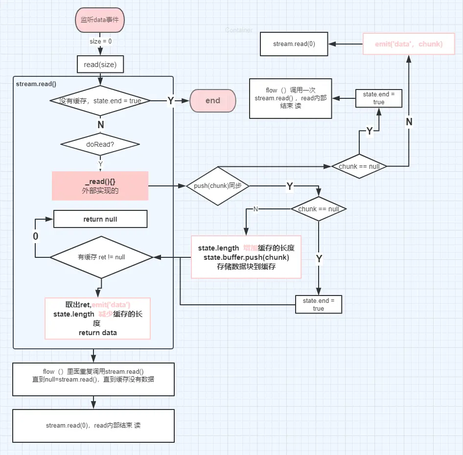 }_read() 函数里面push 是异步,一旦异步操作中调用了push方法,且有数据,无缓存队列,此时会直接emit('data',chunk) 消费掉,然后调用stream.read(0)。