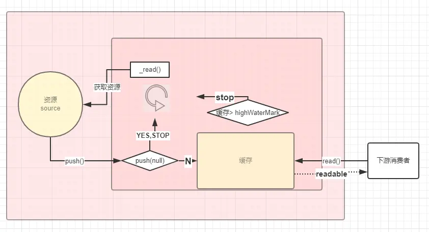 如果获取的数据大于缓存池数据, .read(size) 会返回null, 底层会自动读取数据存储进缓存池并发出“readable”事件,通知消费。当消费者获得数据后,如果资源池缓存低于highWaterMark值,底层会读取并往缓存池输送数据,直到缓存高于highWaterMark值(数据足够的情况)