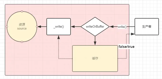 调用 writable.write(chunk) ,如果此时正在进行底层写,此时的数据流就会进入队列池缓存起来,如果此时没有则会调用_write()将数据写入目的地。