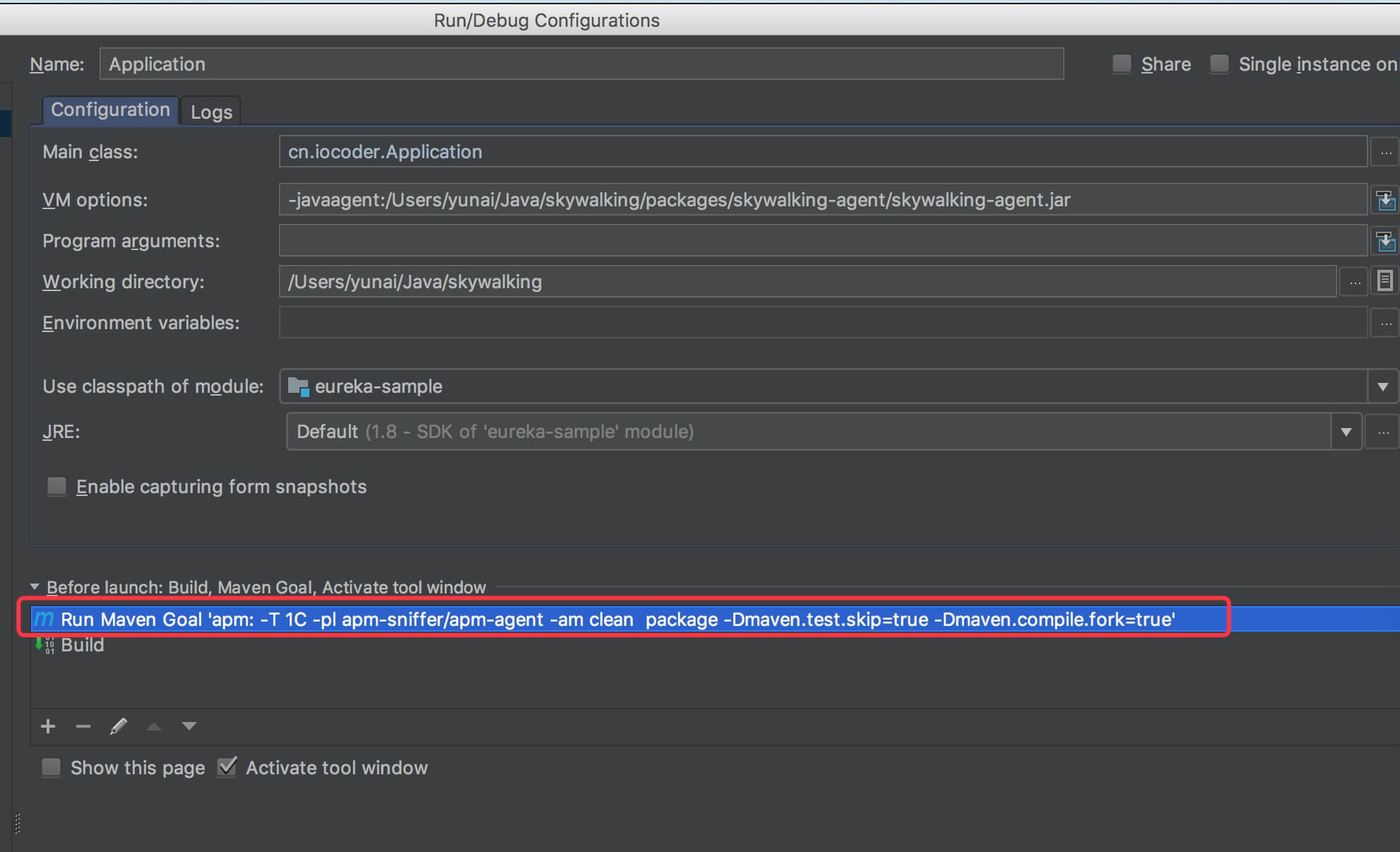 #main(args)方法,并增加 JVM 启动参数,-javaagent:/path/to/skywalking-agent/skywalking-agent.jar。/path/to参数值为上面我们编译出来的 /packages/skywalking-agent 目录的绝对路径。如下图 :