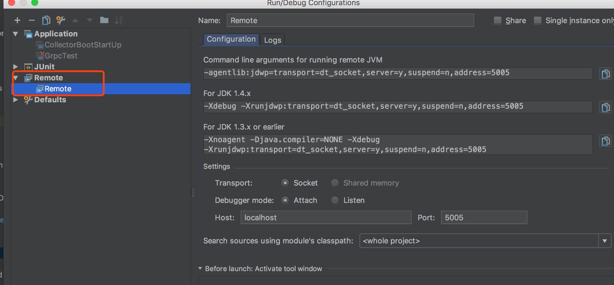 另外,使用 IntelliJ IDEA Remote 远程调试,也是可以的。如下图 :