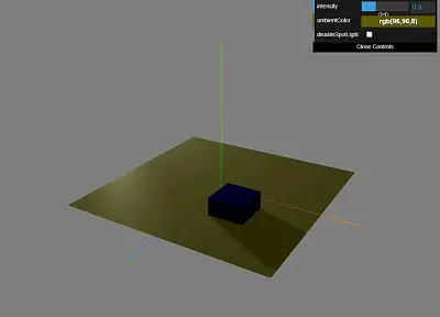 以下的gif图中可以直观看出AmbientLight颜色的设置, intensity的设置对整个renderer的影响, 通关开关spotLight也可以看出仅仅只有AmbientLight的话是非常暗淡和单调的, 有了spotlight, 并且设置了应用, 整个场景才更加自然.