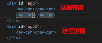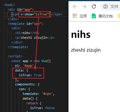 虽然调用的是cpn但是他是属于app里的,就相当于把<cpn></cpn>当做了#app中的一个普通的标签。所以用的isTrue是vue中的data