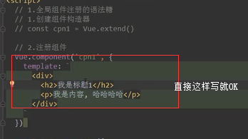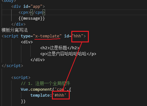 - 第一种写法,在上边写个script标签,类型是x-tempate,然后注册的时候关联他的id。