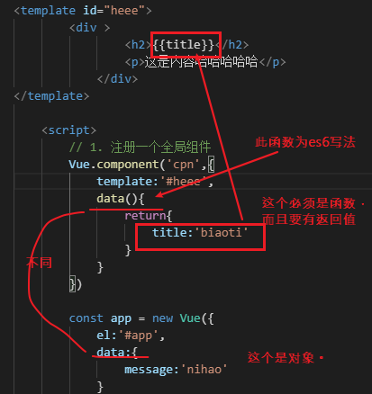 - 要在组件注册的时候,放在data函数中,这是一个函数,和vue实例中的不同,