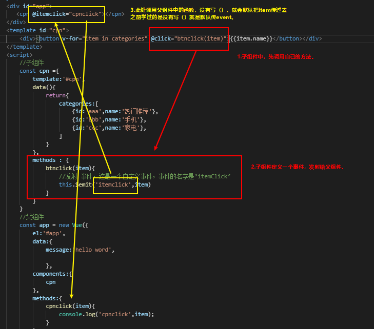 $emit()来触发事件, - 父组件中,通过v-on来监听子组件事件。