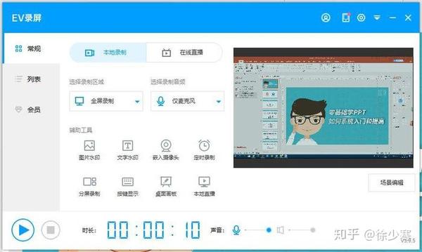EV录屏操作简单,支持全平台(Windows、Mac、iOS和安卓),而且还有加水印(图片和文字)、嵌入摄像头、定时录制、分屏录制、在线直播等。