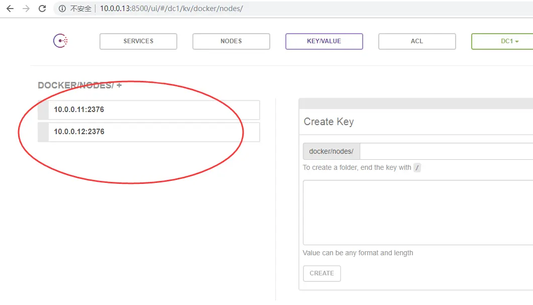 在KEY/VALUE -> docker -> nodes 下如果有你创建的两个节点docker01(10.0.0.11),docker02(10.0.0.12),说明成功。