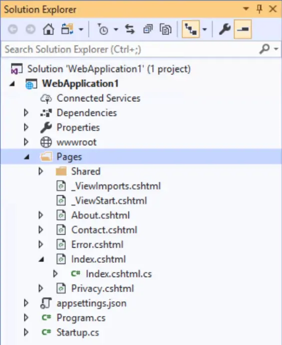 Pages文件夹包含网站的Razor Pages。默认模板提供了多个页面,包括应用程序主页的Index.cshtml页面以及About、Contact等。