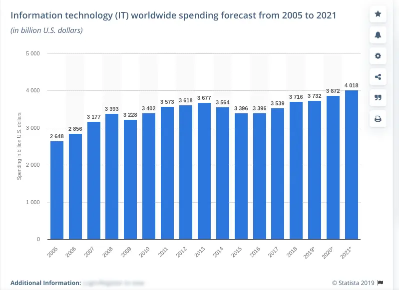 据估计,到 2021 年,全球 IT 支出将达到 40,180 亿美元。下图是 Statista 从 2005 年到 2021 年的调查结果。